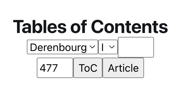 Enter an article number (here, 477), and click ToC to scroll to the correct line in the Table of Contents; clicking Article will jump straight to the webpage for article 477.